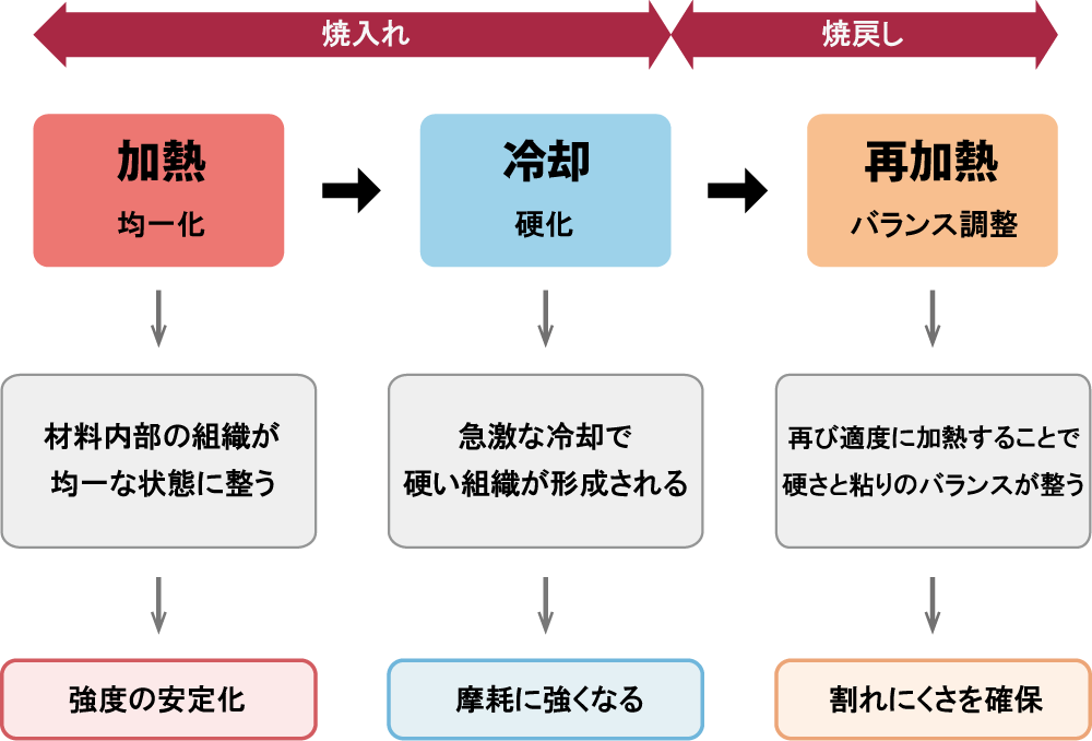 | 靭性 | 衝撃や負荷変動での割れを防ぐ | 焼戻しで硬さと粘りを調整 |